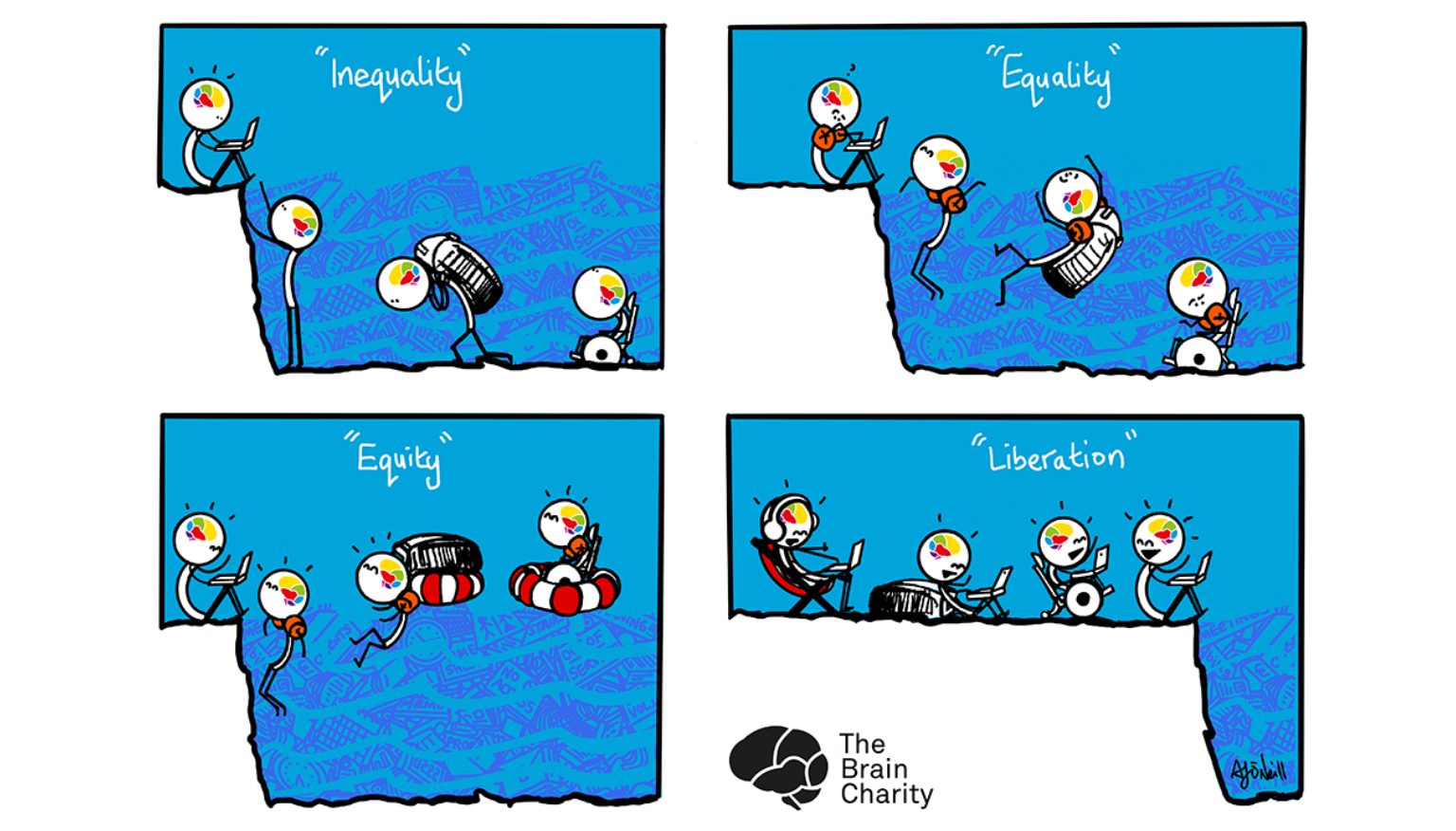 In our updated graphic, people are floating in a sea of tasks. In the inequality version, no help is offered. In the equality version, each character receives the same orange armbands. But for some, like people using wheelchairs, or those carrying heavy backpacks symbolising invisible cognitive loads, that support isn’t enough. In the equity version, each person receives a flotation device suited to their needs. And in the final stage – liberation – everyone is on dry land, no longer overwhelmed, enjoying themselves.